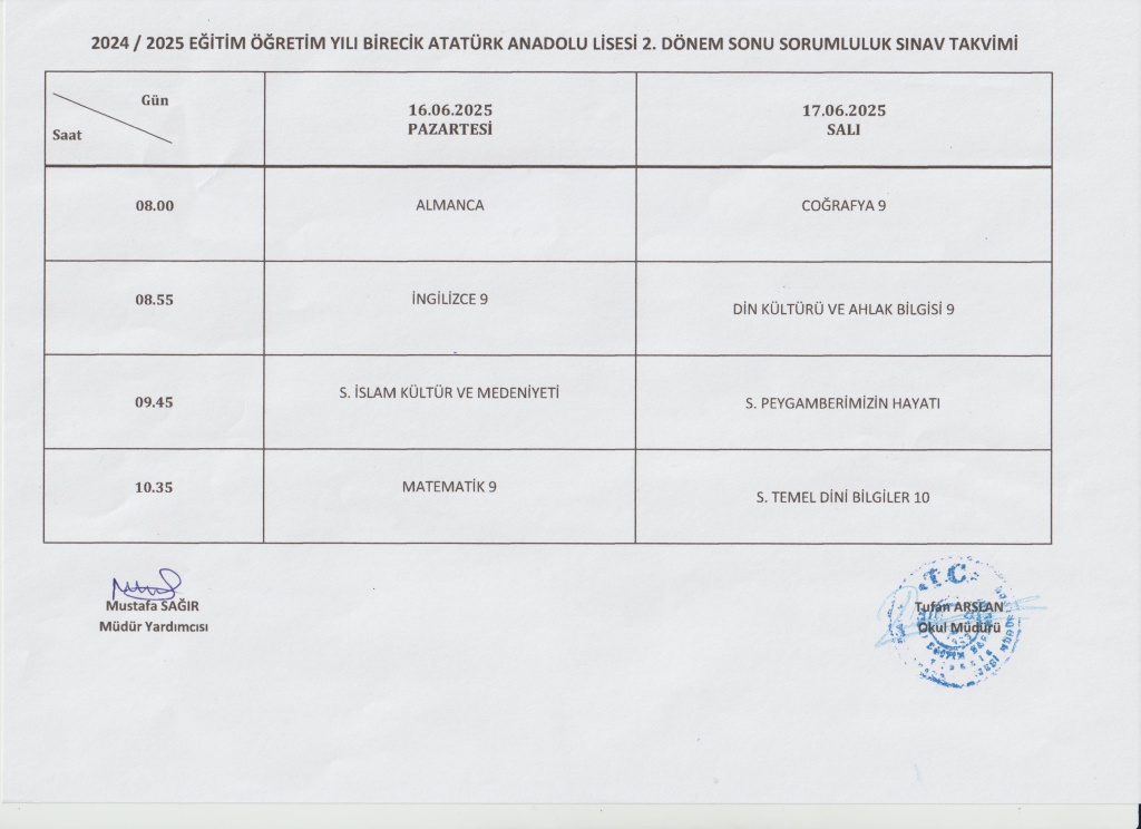 2024-2025 Eğitim Öğretim Yılıl Sene Sonu Sorumluluk Sınav Takvimi